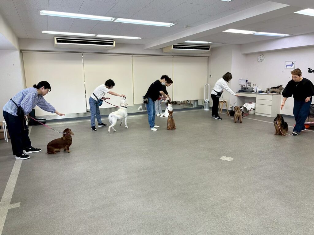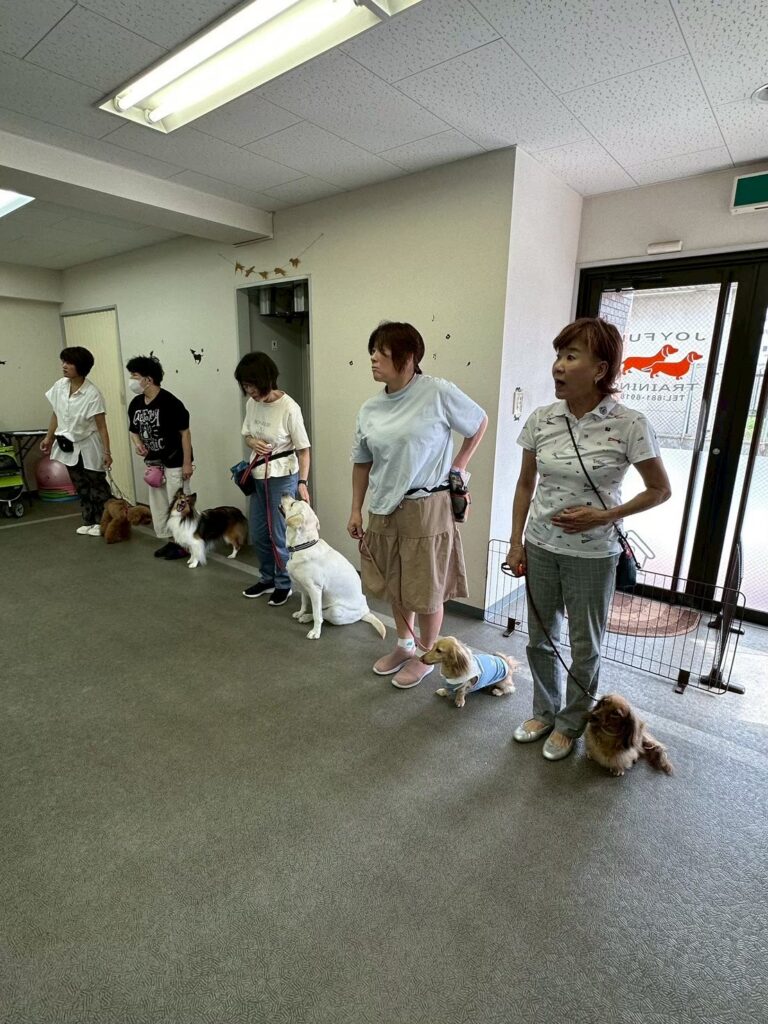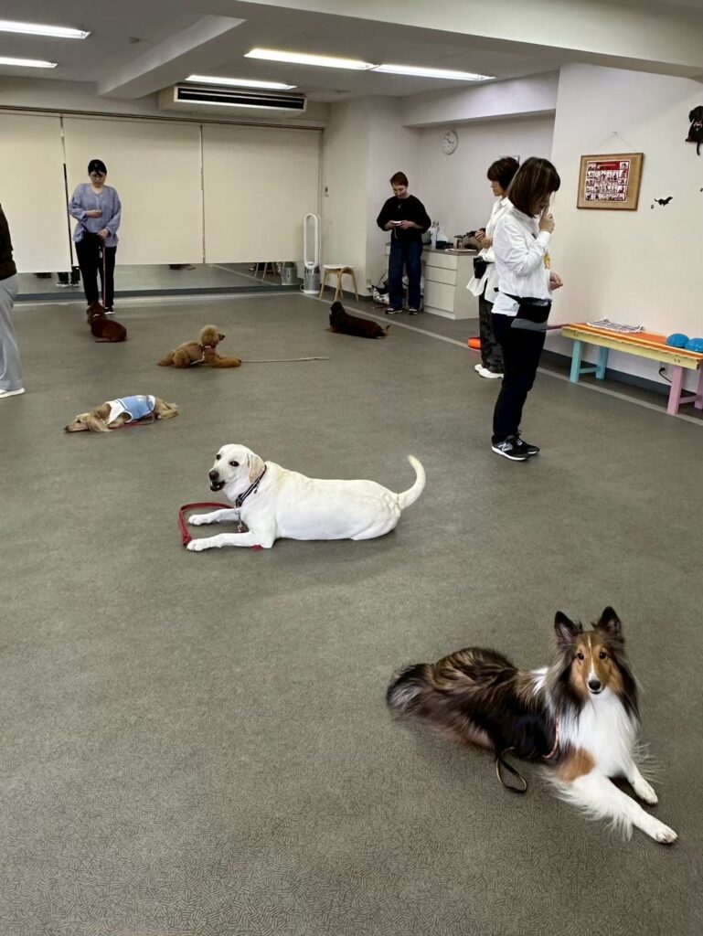 他のワンコと練習することで周りに左右されず集中すること、指示に従うことを目標にしました。