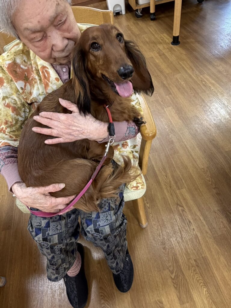 そんぽの家中村公園を訪問しました。チワワのアオちゃん、ミニチュアダックスのももちゃんとステラです。ふれあいタイムでは、たくさん撫でていただき「かわいいね」と可愛がっていただきました。